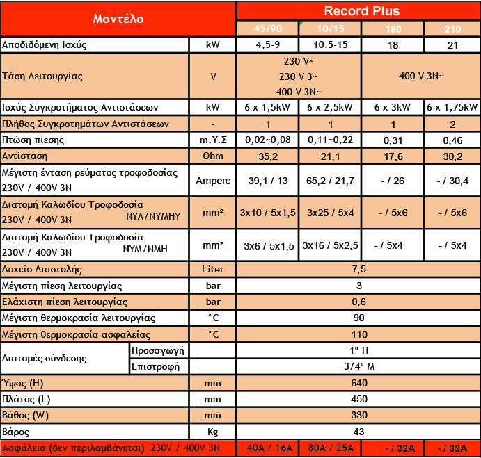 Ο ηλεκτρικός λέβητας Record Plus είναι κατάλληλος για κάθε είδους σύστημα κεντρικής θέρμανσης ( μονοσωλήνιο ή δισωλήνιο). Συνεργάζεται άριστα με θερμαντικά σώματα, Fan Coil Units και ενδοδαπέδια συστήματα θέρμανσης αλλά και ως δευτερεύουσα πηγή θερμότητας για εγκαταστάσεις με αντλία θερμότητας.